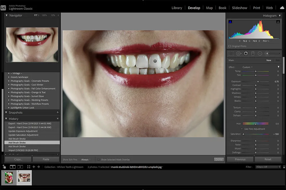 Lightroom provides several advantages for teeth whitening. Its non-destructive editing process ensures that your original image remains untouched, allowing you to experiment with different techniques without risk. The software offers precise control over the whitening process, allowing you to target specific areas of the teeth and adjust the intensity of the effect. With Lightroom, you have access to a wide range of tools, including local adjustment brushes, graduated filters, and color adjustments, to achieve natural-looking results. Lightroom also allows for batch processing, which means you can apply the same whitening adjustments to multiple photos efficiently, saving you valuable time.